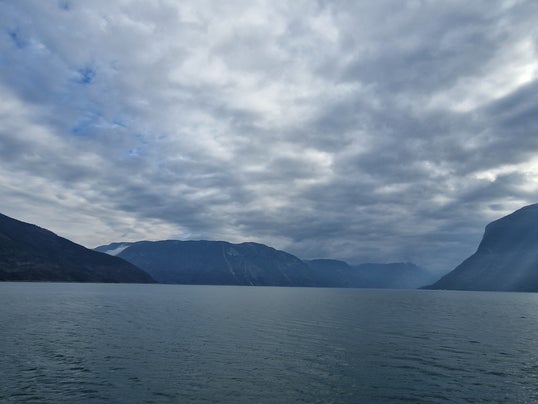 Von Laerdal aus bei recht trübem Wetter gestartet in Richtung Norden und die Straße führte zunächst zu einer Fähre.
