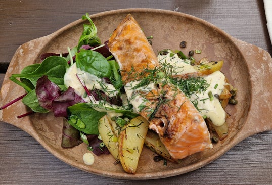 Man kann im Village natürlich auch was Leckeres essen, z.B. Lachs vom offenen Feuer.