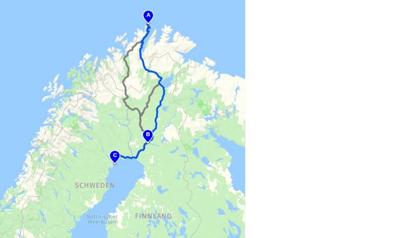 Hier einmal zur Verdeutlichung: am Donnerstag bin ich am Nordkap/Norwegen (Punkt A) gestartet. Mit einem Zwischenstopp war ich zwei Tage in Rovaniemi/Finnland (Punkt B) und bin heute ca. 280 km nach Lulea/Schweden (Punkt C) gefahren. Das liegt nun 1000 km vom Nordkap entfernt.