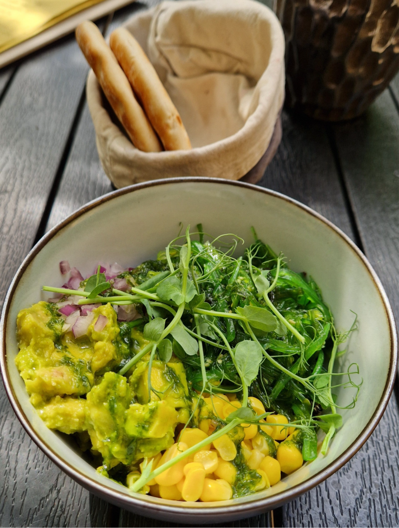 Am Mittag habe ich in einer Seitengasse ein kleines Café gefunden, wo man draußen unter Apfel- und Kirschbäumen eine Kleinigkeit essen konnte. Gebackene Flunder mit einer Art Pesto, auf Backpapier serviert, und ein Superfood-Salat. War ganz gut.